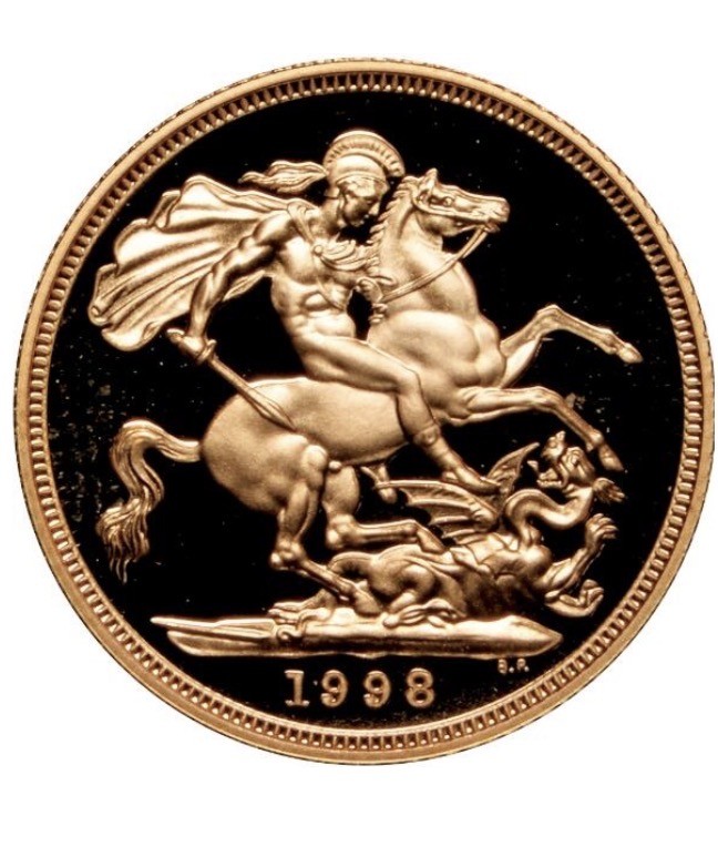 1998 Elizabeth II Proof Sovereign. Crowned Bust. George and Dragon reverse. Sold with original case and certificate.